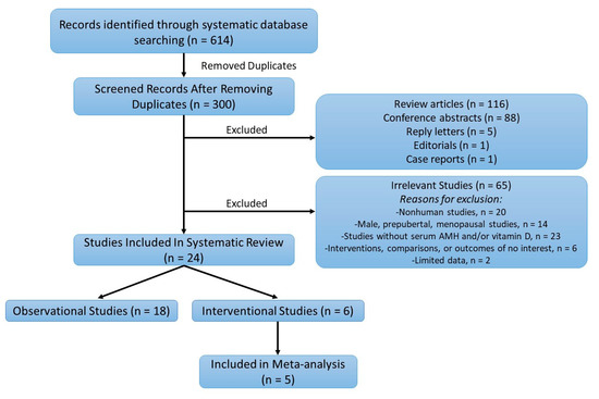 The systematic literature search retrieved 614 articles. Figure 1 summarizes the number of publications that were identified during the initial search and the number of publications that were finally selected for inclusion after appropriate exclusion. After removing 300 duplicates, and 211 studies that were not original cohort articles, 65 articles were excluded by screening the title and abstract, and then, the remaining 24 articles were inspected carefully for eligibility. In total, 18 observational studies and 6 interventional studies were selected for the systematic review. Among the six interventional studies, five included the relevant information of pre- and posttreatment AMH and vitamin D values and were selected for data extraction and meta-analysis. The quality assessment of the studies selected for the meta-analysis is shown in Supplementary Table S1.