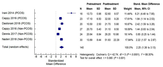 In the five studies included in the meta-analysis, the effects of vitamin D supplementation on serum 25OH-D concentrations were assessed in six cohorts of patients (three PCOS and three non-PCOS), a total of 140 women. The baseline mean serum vitamin D concentrations across studies ranged from 10.5 to 20.7 ng/mL pretreatment, indicating that the majority of women had vitamin D deficiency. The mean serum concentrations post-vitamin D treatments ranged from 21.7 to 52.6 ng/mL. In all studies, significant increases in serum vitamin D levels were noted following vitamin D supplementations, with SMD ranging from 0.84 to 6.21, indicating the efficacy of vitamin D supplementations in all studies. The overall standardized mean difference (SMD) was 2.25 (95% CI 1.38 to 3.13, p < 0.001) (Figure 2).