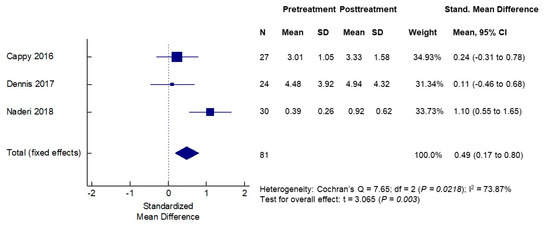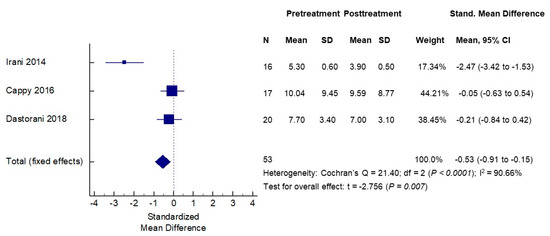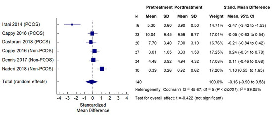 The effects of vitamin D supplementation on serum AMH concentrations were assessed in the same six cohorts of patients (three PCOS and three non-PCOS), a total of 140 women. The baseline mean serum AMH levels in the PCOS groups ranged from 5.30 to 10.04 ng/mL and, as expected, were higher than the mean serum AMH levels in non-PCOS groups that ranged from 0.39 to 4.48 ng/mL. The mean serum AMH concentrations post-vitamin D treatments ranged from 3.90 to 9.59 ng/mL in the PCOS cohorts, while they ranged from 0.92 to 4.94 ng/mL in the non-PCOS groups. When analyzing PCOS and non-PCOS cohorts together, no significant changes in serum AMH levels were observed following vitamin D supplementations (SMD −0.16, 95% CI −0.90 to 0.58) (Figure 3). However, significant opposite changes in serum AMH levels posttreatment were noted when the PCOS and non-PCOS cohorts were analyzed separately. In the meta-analysis of three PCOS cohorts (n = 53 women), the serum AMH was significantly decreased following vitamin D supplementation (SMD −0.53, 95% CI −0.91 to −0.15, p < 0.007) (Figure 4). In contrast, in the meta-analysis of three non-PCOS cohorts (n = 81), serum AMH was significantly increased following vitamin D supplementation (SMD 0.49, 95% CI 0.17 to 0.80, p = 0.003) (Figure 5).