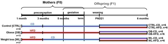 Animal model of preconception maternal weight trajectories. C57BL/6J F0 females were fed a control diet (CD, blue), a high-fat diet (HFD, red) or an HFD for two months and then switched onto the CD. On postnatal day 21 (PND21), half of the litter was weaned onto the HFD and the other half under the paired-CD diet, resulting in six groups: CD-CD, CD-HFD, OB-CD, OB-HFD, WL-CD and WL-HFD. All male offspring were followed until the age of six months. The number of animals studied (n) is indicated for each group.