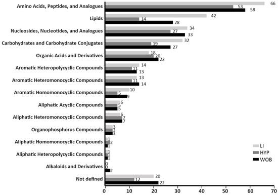 Metabolomics investigations were performed by LC–HRMS. Up to 471, 292 and 394 variables were annotated in positive and negative ionization mode, corresponding to 293, 206 and 271 unique metabolites, in the LI, HYP and WOB, respectively. Some of these had multiple annotations (between two and seven putative identities): 73 in the LI, 46 in the HYP and 68 in the WOB. Interestingly, the five main chemical metabolite classes were similar for all tissues: amino acids, carbohydrates, nucleosides, lipids and organic acids. The main difference between tissues was the number of metabolites in each chemical class (Figure 2).