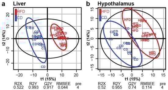 Post-weaning HFD had a global impact on the liver and hypothalamus metabolomes. Score plots from the PLS-DA classification into HFD and CD groups for the LI (a) and HYP (b). No model was built for WOB. A model is considered robust when the response variance explained (R2Y) is higher than the predictive performance of the model (Q2Y). A model with a Q2Y > 0.5 is considered to have a good predictive performance.