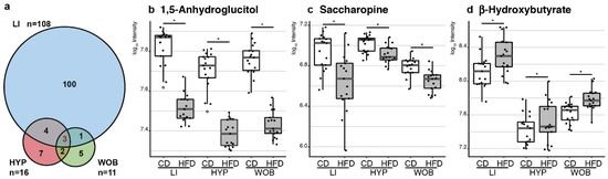 In the LI, the metabolic profile differed considerably between post-weaning diets: Significant differences were observed for 108 metabolites, corresponding to more than one-third of the initial set (Figure 4a). The fold-change in levels ranged from 2.32 to −2.27, with four metabolites having absolute fold-change values >1.5. The abundance of 53 metabolites decreased in animals fed an HFD, whereas the abundance of 55 metabolites increased (Table 1). In the HYP and the WOB, the levels of 16 and 11 metabolites, respectively, were significantly affected by post-weaning diet, accounting for 8% and 4% of the initial set of metabolites, respectively (Figure 4a). The absolute fold-change values obtained were less than 1.5. Upregulation was observed for 13 out of 16 metabolites in the HYP and 4 out of 11 metabolites in the WOB (Table 1). The post-weaning diet therefore had a significant effect on the abundance of metabolites in the LI and, to a lesser extent, in the HYP and WOB.