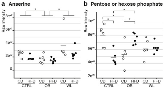 Two liver metabolite levels were affected by maternal diet group. (a) In the OB offspring, the abundance of anserine was significantly lower than that in CTRL and WL offspring. Anserine abundance did not differ significantly between the CTRL and WL offspring. This effect was independent of the post-weaning diet. (b) In the CTRL offspring, the abundance of P/H-P was significantly lower in animals fed the HFD. In the OB offspring, the opposite trend was observed: the abundance of P/H-P was significantly increased by the HFD. Furthermore, CTRL-CD and OB-CD offspring differed significantly from each other, as did CTRL-HFD and OB-HFD offspring. Finally, WL-CD and WL-HFD offspring were not significantly different from other offspring groups. Each dot represents an individual, and * indicates an adjusted p-value < 0.05.