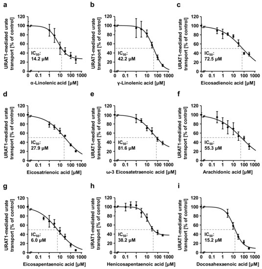 Chicago/Turabian StyleSaito, Hiroki, Yu Toyoda, Tappei Takada, Hiroshi Hirata, Ami Ota-Kontani, Hiroshi Miyata, Naoyuki Kobayashi, Youichi Tsuchiya, and Hiroshi Suzuki. 2020. "Omega-3 Polyunsaturated Fatty Acids Inhibit the Function of Human URAT1, a Renal Urate Re-Absorber" Nutrients 12, no. 6: 1601. https://doi.org/10.3390/nu12061601