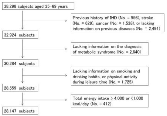Participants from seven study centers that used the same questionnaires and performed examination of blood glucose were included (no. = 38,298, dataset of version 2019.7.29). We excluded participants who had a history of ischemic heart disease (IHD), stroke, or cancer, or who lacked information on previous diseases (No. = 5374), information needed for the diagnosis of MetS (no. = 2640), smoking and drinking habits, physical activity during leisure time (no. = 1725), or whose total energy intake was extremely high or low (≥4000 or <1000 kcal/day) (no. = 412) (Figure 1). A total of 28,147 participants (14,042 men and 14,105 women) were used for statistical analysis.