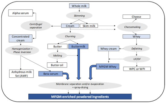 Destabilizing the milk fat globule natural emulsion is at the basis of most of the commercial processes to produce MFGM-enriched ingredients [31,32]. As illustrated in Figure 1, cream that is obtained by skimming whole milk constitutes the raw material for butteroil or anhydrous milk fat (AMF) and butter manufacturing. Beta serum and buttermilk, the co-products of these two dairy foods, contain most of the MFGM components, including minor lipids and MFGM proteins. Cheese whey, the co-product from cheesemaking processes, is also considered a potential source of MFGM-enriched ingredients since it contains residual fat mainly composed of milk minor lipids and MFGM proteins. This fat must be removed from the whey feed before the valorization of whey proteins as whey protein concentrates (WPC) or whey protein isolates (WPI). The phase inversion obtained by churning of a fat cream generates butter grains mainly composed of triacylglycerol (TAG) together with buttermilk, an aqueous phase having an overall composition similar to that of skim milk but also containing MFGM constituents. Buttermilk downstream processing can simply consist of evaporation and spray drying, but membrane separation processes can be applied in order to increase the protein and MFGM content of the MFGM-enriched powder.