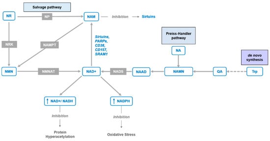 NAD+ synthesis pathways. The figure depicts NAD+ de novo pathway from tryptophan (Trp) through quinolinic acid (QA), Preiss–Handler pathway from nicotinic acid (NA) via nicotinic acid adenine dinucleotide (NAAD) and NAD synthetase (NADS), and “salvage pathways” from nicotinamide riboside (NR) and nicotinamide mononucleotide (NMN) via purine nucleoside phosphorylase (NP) and nicotinamide phosphoribosyltransferase (NAMPT) enzymes or nicotinamide ribose kinases (NRK) and NMN/NaMN adenylyltransferases (NMNAT), respectively.