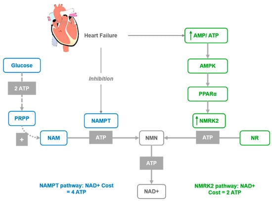 Activation of the NMRK2 pathway represent a common adaptive mechanism in the failing heart where NAD+ levels are low. NAD+ synthesis from NR through the NMRK2 pathway may be favored, as the NMN synthesis from NR by NMRK enzymes requires only one ATP molecule while synthesis from NAM by NAMPT requires at least three ATP equivalents.