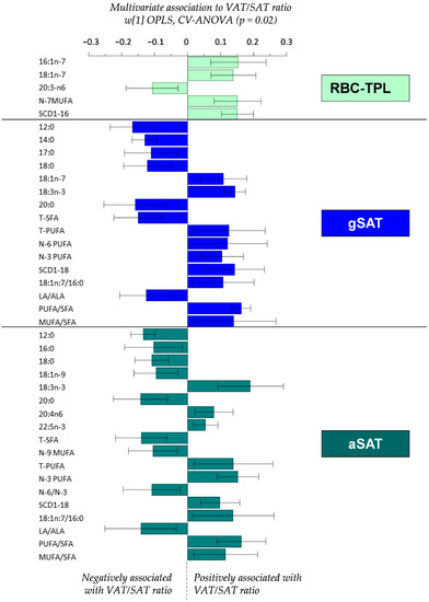 Data were expressed as mean ± standard deviation (SD) or median interquartile range (25th–75th percentile) depending on the normality of quantitative variables. Normality was tested using the Shapiro–Wilk test and data were log-transformed before analysis if p values from the normality test were lower than 0.05. The comparison of FA composition between RBC, aSAT and gSAT was performed using a one-way repeated measures ANOVA (using Stata software v.13.1). The relationship between FA profiles in each tissue type and VAT/SAT ratio and SI were explored using projection based multivariate analysis. Firstly, the data set was inspected by a principal component analysis (PCA) to detect groupings, trends and outliers. The associations between tissue-specific FA composition and VAT/SAT ratio and SI were subsequently explored using orthogonal partial least squares of analyses (OPLS). All models were validated based on ANOVA of the cross-validated OPLS scores (CV-ANOVA) for significance testing [40]. All OPLS analyses were performed using SIMCA v.16. FAs were considered significant when fulfilling the statistical significance criteria using post-hoc linear regression on loadings calculated from the validated OPLS models on a 95% confidence level [41].