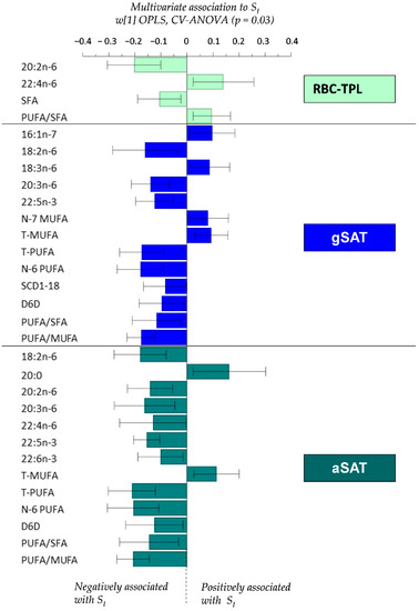 The relationships between FA profiles (RBC-TPL and SAT depots) and SI are presented in Figure 2. Higher RBC-TPL total SFA and 20:2n-6, and lower 22:4n-6 were associated with lower SI. In gSAT, PUFAs (LA, DGLA, DPA n-3, total n-6, total PUFA) and SCD1-18 and D6D indices were inversely correlated with SI, while MUFAs (16:1n-7, total n-7 and total MUFA) were positively associated with SI. Likewise, total MUFA in aSAT were positively associated with SI, while individual PUFA (LA, eicosadienoic acid, DGLA, adrenic acid, DPA n-3, DHA, total n-6, total PUFA) and the D6D index were negatively associated with SI.