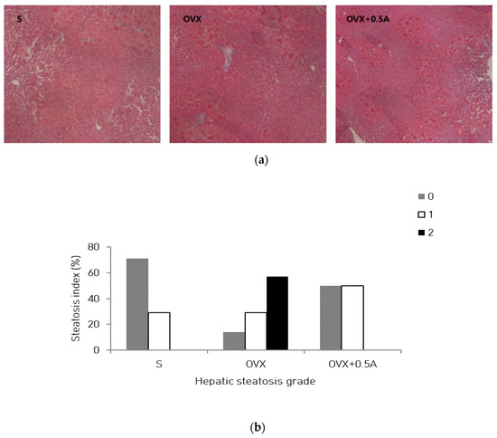 Effect of A. pilosa supplementation on hepatic steatosis in OVX rats fed an HFD. (a) Photomicrographs of hematoxylin and eosin-stained liver from representative rats in (left) S, (middle) OVX, and (right) OVX + 0.5A groups (×400). (b) Percentages of rats with each hepatic-steatosis grade (0–3 scale) for each group. Hepatic steatosis graded as 0 (fatty hepatocytes occupying <5% of hepatic lipids), 1 (fatty hepatocytes occupying 5–33%), 2 (fatty hepatocytes occupying 34–66%), or 3 (fatty hepatocytes occupying >66%). Abbreviations: S, sham-operated + HFD; OVX, ovariectomized + HFD; OVX+0.5A, ovariectomized + HFD with 0.5% aqueous A. pilosa extract.