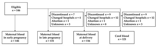 Figure 1 shows the participant flowchart for final number of blood sample analysis at each time point. At the time of recruitment, 146 samples could be measured in early pregnancy, but further serum samples could not be obtained from some subjects, with 131 samples obtained in late pregnancy, 116 at delivery, and 121 from cord blood.