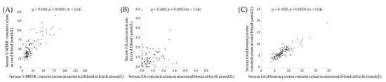 Correlation of 5-MTHF (A), FA (B) and (C) total homocysteine between maternal and cord blood at birth. Spearman correlation coefficient ρ, and p-value. 5-MTHF, 5-methyltetrahydrofolate; FA, folic acid.