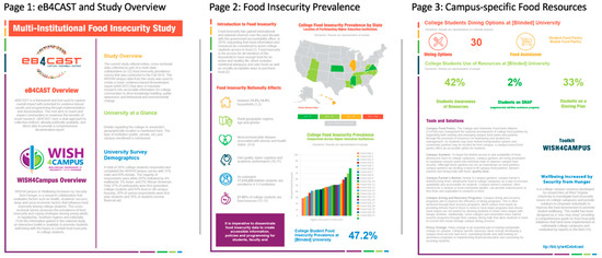 The campus-specific eB4CAST food insecurity reports were designed by the eB4CAST research team with insight from a graphic designer. The eB4CAST team consists of two graduate students, one postdoctoral fellow, and a lead principal investigator with 20+ years of public health and dissemination research. Each report included four pages. Page one provided details on the eB4CAST approach and the multi-institutional food insecurity study as well as campus demographics specific to this study. Page two provided an overview of college food insecurity and showed the food insecurity prevalence estimates at all participating institutions. Page three reported on the student use and awareness of campus food insecurity resources as well as highlighting campus-specific food insecurity resources that are available for students. Page four showcased all the research partner logos and references. The data in each report was customized for each participating university. A sample report is shown in Figure 1.