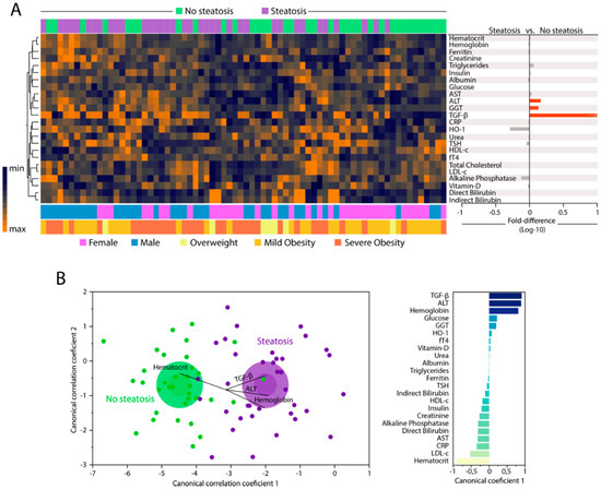 We examined the expression of 25 parameters in peripheral blood to compare the biochemical/inflammatory profiles of individuals with or without hepatic steatosis. A summary of the univariate comparisons is described in Table S2. Unsupervised hierarchical clustering analysis of the log10-transformed and z-score normalized values/concentrations of each parameter revealed no clear distinction of biochemical profiles between the study groups when all markers were examined simultaneously. Individuals with hepatic steatosis exhibited a tendency of decreased levels of HO-1 and alkaline phosphatase, and increased levels of triglycerides, AST, ALT, GGT, and TGF-β (Figure 1A, left panel and Figure S1). Furthermore, fold-difference analysis of the circulating concentrations of each biochemical marker are summarized in Figure 1A, right panel. Among all markers, only median values of ALT, GGT, and TGF-β were statistically distinct between the study groups, with higher values being detected in the group of participants with hepatic steatosis (all with adjusted p-values < 0.05). After identifying the consistent changes in the concentrations of biochemical parameters between the clinical groups, we employed a discriminant model using sparse canonical correlation analysis (CCA), as previously described [32,33,34] to test whether the statistical relationships between the biomarkers, rather their concentrations/values themselves, could be used to distinguish the groups. Using this approach, we found that the patients with hepatic steatosis could be distinguished from those without steatosis with high degree of accuracy (area under the curve (AUC) of the receiver operator characteristics (ROC) curve = 0.97 (CI: 0.85–1.0), sensitivity 91% (CI: 77.0–96.7), specificity 86% (72.0–94.0); p < 0.0001, Figure 1B, left panel). Assessment of the canonical coefficient values of the CCA model revealed that the most significant markers responsible for the discrimination between individuals with or without steatosis were LDL-c, triglycerides, TGF-β, ALT, HDL-c, and hematocrit (Figure 1B, right panel).