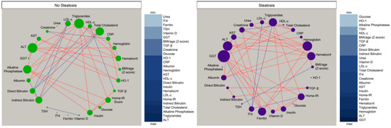In the group of participants without steatosis, we detected eight negative significant correlations whereas in the group of hepatic steatosis, six negative correlations were observed, highlighting fT4, that exhibited only negative interactions with values of Homa-IR, triglycerides, LDL-c, and GGT. Of note, the markers exhibiting the highest number of significant relationships in the group of individuals without hepatic steatosis were alkaline phosphatase, ALT, and triglycerides (Figure 2, left panel) whereas in the group of patients with steatosis, GGT, ALT, and hemoglobin were the markers with the highest connectivity in the networks (Figure 2, right panel). The analyses also revealed that TGF-β was not the marker with the highest number of correlations in the distinct matrices. However, such marker was related with different parameters in the networks, and with distinct correlation profile (positive vs. negative correlations) (Figure 2), which explained in part why TGF-β was relevant to explain the differences between the study groups described in the discriminant model based on correlations described in Figure 1B. Thus, these results argue that hepatic steatosis is associated with alterations in the profile of correlations between values of the biochemical parameters evaluated here.
