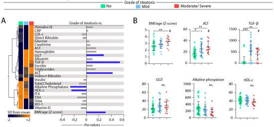Spearman correlation of biochemical parameters in blood of patients according grade of hepatic steatosis. (A) Left panel: Data on each parameter was Log10 transformed. Mean values for each indicated clinical group were z-score normalized and a Hierarchical cluster analysis was performed to illustrate the overall biochemical profiles according the grade of diseases. Right panel: Correlation between grade of hepatic steatosis and biochemical parameters. Spearman correlation analysis was used, and rho values are shown. Blue lines represent correlations with statistical relevance. (B) Scatterplots of concentrations of indicated parameter which values presented statistically significant differences between the study groups using the Kruskal-Wallis test with Dunn’s multiple comparisons ad hoc test (* p < 0.05, ** p < 0.01, *** p < 0.001, ns: nonsignificant) # represent statistical significance (p < 0.05) of non-parametric linear trend ad hoc test. Bars represent median values whereas whiskers represent the interquartile ranges. Abbreviations (alphabetic order): ALT: alanine aminotransferase; AST: aspartate aminotransferase; BMI: body mass index; CRP: C-reactive protein; fT4: free thyroxine; GGT: gamma-glutamyl transferase; HDL-c: high density cholesterol; HO-1: heme oxygenase-1; TGF-β: transforming growth factor β; TSH: thyroid-stimulating hormone.