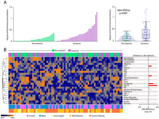 We next tested whether gradual increases in the severity of hepatic steatosis are proportional to changes in values of biochemical parameters in blood. Median values of each biochemical parameter per group of individuals stratified according to the grade of hepatic steatosis were calculated (Table S3). These values were log10-transformed, and z-score normalized, to build a heatmap to illustrate trends in data variation (Figure 3A, left panel). This analysis revealed that the individuals stratified based on the grade of steatosis exhibit a distinct expression profile of biochemical parameters. Hierarchical clustering of the biochemical parameters could identify three principal clusters. The first cluster displayed relatively higher values of hematocrit, CRP, LDL-c, direct bilirubin, glucose, creatinine, and AST in those with ultrasonographic diagnosis of moderate or severe steatosis (Figure 3A, left panel). The second cluster exhibited markers that had similar levels between the groups with mild or moderate/severe steatosis, with increased levels of hemoglobin, GGT, and albumin. In addition, TGF-β levels were relatively higher in the group of mild disease, whereas triglycerides and ALT values were higher in moderate/severe steatosis (Figure 3A, left panel). The last cluster showed increased levels of total cholesterol, alkaline phosphatase, HDL-c, fT4, urea, HO-1, and vitamin D in the group of individuals without hepatic steatosis (Figure 3A, left panel).