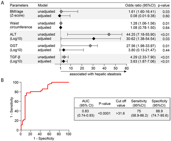 Biochemical parameters associated with hepatic steatosis. (A) Multivariable regression model of variables that were statistically significant (p < 0.05) in univariate comparisons (see univariate comparisons in Tables S1 and S2). (B) Receiver Operator Characteristic (ROC) curves were employed to test the performance of TGF-β to distinguish patients with or without hepatic steatosis. Abbreviations (alphabetic order): ALT: alanine aminotransferase; AST: aspartate aminotransferase; AUC: area under the curve; BMI: body mass index; 95% CI: 95% confidence interval; GGT: gamma-glutamyl transferase; TGF-β: transforming growth factor β.