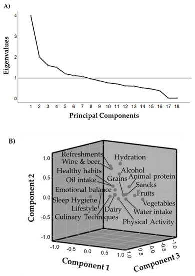 The 10 categories and 8 dimensions were summarized in seven components by PCA, which explained over the 68% of the variability. Factor rotation is commonly used to improve the reliability and reproducibility of categories [44]. An inherent problem with this procedure is that there is not a unique solution to the rotation. The best solution is to decide a simple structure, which is achieved by rotating components around the origin categories until each component is co-linear with a distinct cluster of vectors [45]. An oblique rotation was used to extract the constant of each category over each component. The oblique rotation allows factors to be correlated. This rotation adds statistical complexity being more accurately represented, because constructs in the real world are rarely uncorrelated [45,46]. After the rotation, the weight of the categories and dimensions was distributed between the seven components, being all categories and dimensions included in some of them. However, physical activity, dairy products, and wine and beers, were only represented in the sixth, fourth and second components, respectively, with strong correlations. This result suggests that the second, fourth and sixth components would be essential to describe the diet behavior in the person.