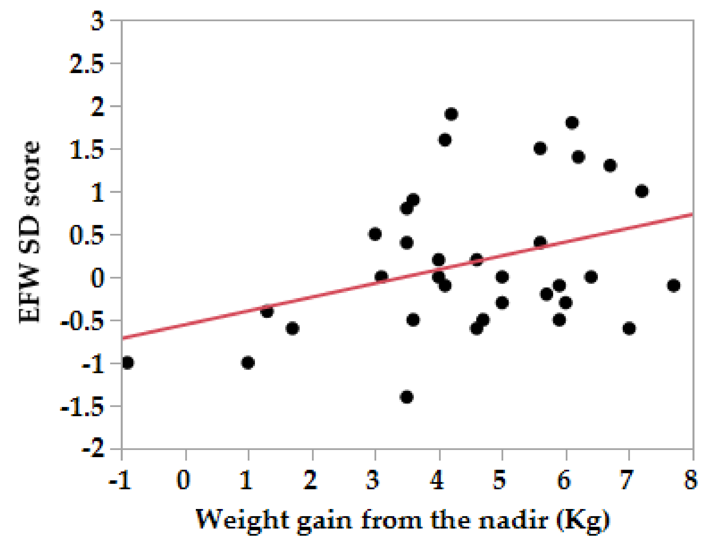 | Weight gain from the nadir (Kg) | 15.0 ± 4.9 (6–25.6) |