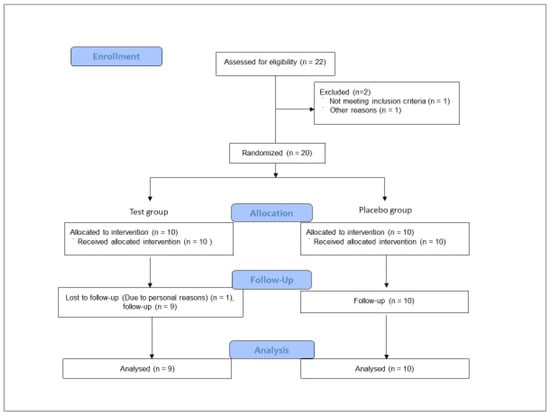 From January 2019 to February 2019, excluding one participant who dropped out of the study for personal reasons, 19 healthy adult females completed the study (Figure 1). The background characteristics for each group are shown in Table 2. There were no significant differences between the two groups in age and body mass index.
