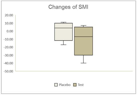 In the evaluation of menopausal symptoms, changes in SMI over 4 weeks showed a trend toward higher values in the test group than in the placebo group, although they did not reach significance (p = 0.079) (Figure 2).