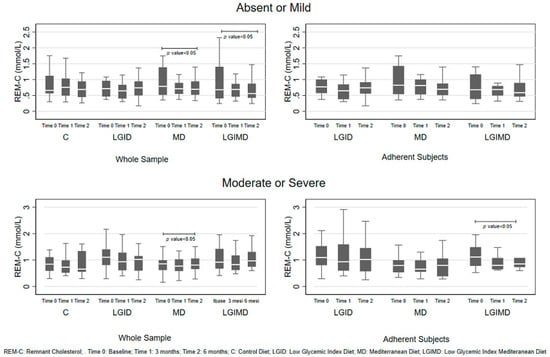 In conclusion, fasting REM-C level is independently associated with the grade of severity of NAFLD and the improvement of the metabolic state of the liver and IR induced by the diet reduces the REM-C level. The Mediterranean dietary pattern may be a useful strategy for reducing the degree of NAFLD in patients with MetS and high-risk CVD to decrease the residual risk associated with REM-C. The LGIMD diet has proven to be more effective than other diets in reducing REM-C in the total sample. However, it is essential to control the SFA intake, especially in subjects with moderate and severe NAFLD.