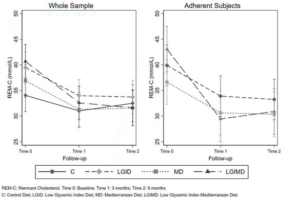 In this research, all diets had a direct effect in lowering the levels of REM-C after 3 and 6 months of intervention in subjects with MetS. In adherent subjects, this effect was stronger mostly among LGIMD as compared to the control group.