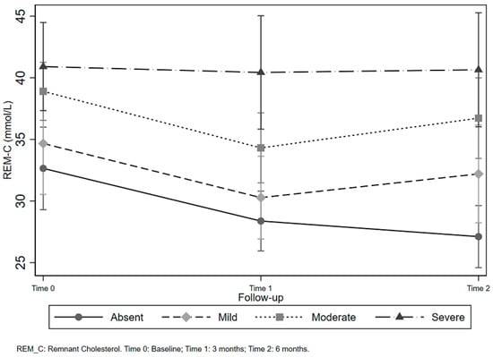 Subjects with severe NAFLD had the most impaired metabolic profile and showed significantly higher levels of REM-C at baseline. Our results are consistent with recent literature. In a prospective observational study, Pastori et al. (2018) [] found that NAFLD was independently associated with higher serum fasting REM-C. In the same work, high REM-C levels were predictive of major adverse cardiovascular and cerebrovascular events in patients with NAFLD. In fact, it is known that subjects with NAFLD have prolonged metabolic disorders involving the glycemic and lipid balance. Dyslipidemia occurs with increased triglycerides, elevated atherogenic lipoproteins (LDL-C and VLDL-C), and reduced HDL-C levels. A glycemic imbalance develops, instead, with the condition of greater resistance to insulin. In this context, it was recently shown that patients with hepatic IR exhibited a higher postprandial triglyceride response than patients with muscle IR or without IR []. In the insulin resistant state, an increased lipolysis of adipocytes causes an increased flow of FFAs in the liver, which feeds APO-B lipidation, leading to an increase in VLDL production and de novo liver lipogenesis [], which is ultimately shown by an increase in remnant cholesterol levels. As suggested by other studies, REM-C is a promising tool for CVD risk assessment since REM-C shares with LDL-C has the potential to enter and be trapped in the arterial wall, triggering plaque formation and progression [,].