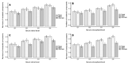 The number of metabolic components according to serum retinol and α-tocopherol levels is presented in Figure 1. Individuals in Q4 of serum retinol and α-tocopherol levels showed the highest number of metabolic components, regardless of sex.