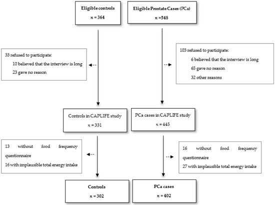 The eligible cases were those subjects who met the following selection criteria: (1) new diagnosis of PCa with histological confirmation (according to the International Classification of Diseases 10th Revision (ICD-10): C61) [27]; (2) age between 40 and 80 years; and (3) residence in the coverage area of the reference hospitals during at least 6 months before their recruitment. The same selection criteria were used for controls except for the diagnosis of PCa. The incident cases were selected from the Urology Department of the participating hospitals, using the Pathological Anatomy listings and checking the new positive biopsies for PCa. When a new diagnosis of PCa occurred, the subject was informed about the study by his urologist and invited to participate in the study. The controls were randomly selected from the population lists assigned to general practitioners of the primary care centers located in the catchment area of the hospitals where the cases were selected (Granada-Metropolitan Sanitary District). The controls were matched to cases by age, with a maximum age difference of 5 years, based on information from the Granada Cancer Registry: a population-based cancer registry with data quality certified by the International Agency for Research on Cancer (https://www.registrocancergranada.es/es/). After applying the selection criteria, a sample of 402 incident PCa cases and 302 controls was assessed (Figure 1). After the cases and controls signed informed consent, they completed an epidemiological questionnaire specifically developed for this study. The interview was carried out by trained interviewers.