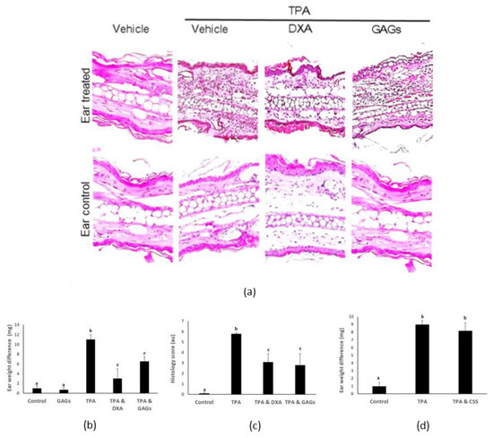 GAGs from sea cucumber (I. badionotus) body wall exert anti-inflammatory effects in a mouse ear inflammation model. Mouse ears exposed to vehicle (control, left ear), or inflammatory agent TPA alone, or TPA followed by dexamethasone (DXA) or GAGs (right ear). (a) Representative photomicrographs of transverse section of mouse ears sensitized with TPA or TPA and test substance, stained with haematoxylin-eosin (magnification 10X). Images are representative of five mice with similar results. (b) Differences in ear weights (right–left) after treatment with TPA or TPA and test substance; n ≥ 5 per group. (c) Histological score for ear micrographs in (a); values are the mean ± SEM, n = 3 per group. (d) Differences in ear weights (right–left) after treatment with TPA or TPA and shark cartilage (CSS); n ≥ 3 per group. Values with distinct superscripts differ significantly from each other (p ≤ 0.05).