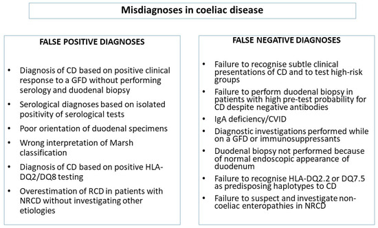 Even if the diagnostic criteria for CD are very clear and the interest of patients and medical specialists in CD has been growing worldwide, the problem of diagnostic errors in CD is still remarkably relevant in clinical practice, as suggested by the large body of published papers on this topic in the last twenty years [48,49,50,51,52,53,54,55,56]. It has been reported that about 20% of coeliac patients are currently unrecognized and diagnoses are still burdened by a significant diagnostic delay [21,40,51,54,57,58,59,60,61,62]. Among patients referred to tertiary centers, CD can be misdiagnosed in as many as 30%–40% of cases [48,49]. Diagnostic errors can occur at any time during the process leading to diagnosis of CD, which includes the moment when the disease should be suspected and a diagnostic hypothesis formulated, the identification of the most appropriate diagnostic tests, and the final decision-making process based on the cognitive analysis of clinical, histological, and laboratory results. A systematic classification of the errors occurring in the diagnosis of CD is currently missing. Clinical errors in internal medicine can be generally divided into missed, delayed, and wrong diagnoses [34,35]. So, two main categories of diagnostic errors in CD can be broadly identified (Figure 1): (i) patients truly affected by CD in whom the diagnosis was not recognized or was missed or delayed (false negative diagnosis of CD); (ii) patients that had been initially diagnosed with CD and in whom, however, CD was not subsequently confirmed upon reinvestigation of their clinical picture (false positive diagnosis of CD). The entire diagnostic process of CD is to be conducted while on a gluten-containing diet, because both serological and histological findings are entirely reversible upon gluten withdrawal. Diagnostic errors can occur in any of the diagnostic steps (serology, endoscopy, histology, and HLA genetic testing) or in any combination of them.