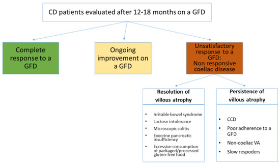 Nonresponsive coeliac disease (NRCD) has been defined as the persistence of symptoms, signs, laboratory abnormalities, or histological changes typical of CD despite adherence to a GFD for 6–12 months [105,106]. We agree with this definition by Penny et al. and we also agree on their statement that in this definition it is necessary to provide a timeframe, but this is inevitably arbitrary. Not only the kinetics of clinical, histological, and serological response to a GFD is highly variable among coeliac patients, but also in the same patient the normalization of clinical, histological, and serological findings can occur at different time points [106]. Since in the Oslo classification a definition of NRCD was not provided [107], we consider the term NRCD as an “umbrella term” referring to variegated clinical scenarios, all characterized by an unsatisfactory clinical/histological response to a GFD, but totally different prognoses. Figure 2 is an attempt of a nosographic classification of all these scenarios. The concept of NRCD does not include those coeliac patients on a strict GFD who have been starting to improve both clinically and histologically since diagnosis, but in whom a full recovery of clinical/laboratory signs, symptoms, and histology has yet to be obtained at time of first follow-up evaluation. Although both advertent and inadvertent dietary lapses are the most common cause of NRCD [105,106], it should be noted that complete resolution of symptoms and histological lesion is achieved only after many years on a strict GFD and this is crucial to prevent long-term poor outcomes and complications. Therefore, the lack of a complete resolution of clinical signs and histology is likely to be due to follow-up examinations performed too early and it should not be taken for NRCD.