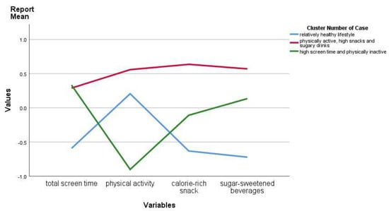 Based on the four lifestyle behaviours, cluster analyses turned out a three-cluster solution (κ agreement = 0.964) as the most adequate and stable representation. Figure 1 presents the three clusters derived from the cluster analysis. Cluster 1 was labelled “relatively healthy lifestyle”, and it was characterized by z-scores < 0 for total screen time, calorie-rich snack and sugar-sweetened beverages consumption, and relatively high in physical activity level (z-score = 0.21). Cluster 2 was labelled “high screen time and physically inactive”, and it was characterized by high total screen time level (z-score = 0.33) and low physical activity level (z-score = −0.90). Cluster 3 was labelled “physically active, high snacks and sugar-sweetened beverages”, and it was characterized by high physical activity level (z-score = 0.56), high calorie-rich snack consumption (z-score = 0.64), and high sugar-sweetened beverages consumption (z-score = 0.57). The means and standard deviations of lifestyle behaviours for each cluster are presented in Table 2.