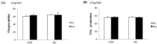 As shown in Figure 1A,B, the sum of 24-h oxygen uptake and CO2 production before and after the 2-week experiments was not significantly different between the CON and RG groups. After 2 weeks of RG intake, there was no significant difference between the CON and RG groups in the comparison of RMR. Moreover, energy expenditure in the active period over 12 h was not significantly different between the two groups (Table 3).
