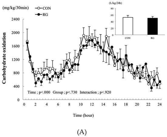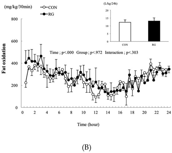 The changes in carbohydrate and fat oxidation occurring 24 h after 2 weeks of RG intake are presented in Figure 2A,B. There was no difference found in the 24-h sum of carbohydrate and fat oxidation between the two groups.