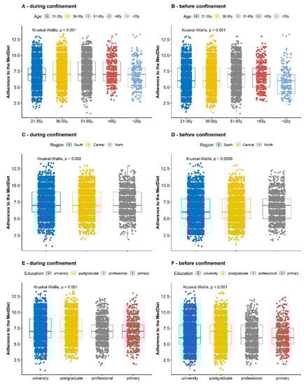 Adherence to the MedDiet before (B, D and F) and during (A, C and E) the Spanish COVID-19 confinement by subgroups of age (A and B), region (C and D) and educational level (E and F). In the box plots, the boundary of the box closest to zero indicates the 25th percentile, a colour line within the box marks the median, and the boundary of the box farthest from zero indicates the 75th percentile. Points above and below the box indicate the 10th and 90th percentiles; those above and below the whiskers indicate outliers. Numbers of included participants per group are shown in Table 1 and Table 2. Differences in mean adherence by groups were evaluated by means of the Kruskal-Wallis test.