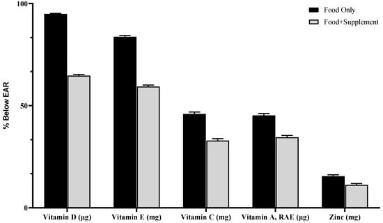 Our research shows that food plus a dietary supplement had a lower prevalence of nutrient inadequacies than food alone. The percentage of the population with usual intakes below the EAR in adults (≥ 19 years) from food only vs. food + dietary supplements for vitamin A (45 to 35%), vitamin C (46 to 33%), vitamin D (95 to 65%), vitamin E (84 to 60%), and zinc (15 to 11%) (Figure 1).