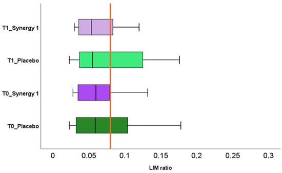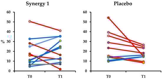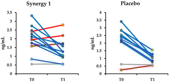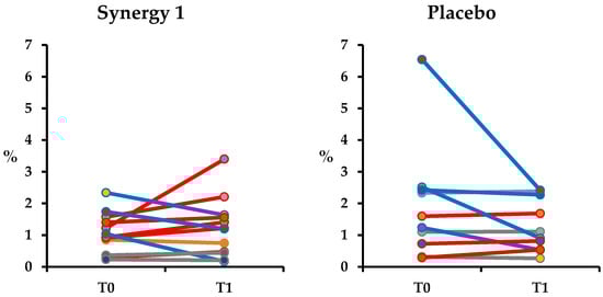 | T0: Placebo Group | T0: Synergy 1 Group | p-Value | T1: Placebo Group | T1: Synergy 1 Group | p-Value | p-Value Placebo T0 vs. T1 | p-Value Synergy 1 T0 vs. T1 | |