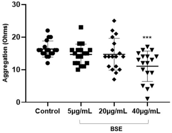 Platelets in whole blood were stimulated for aggregation using 5 µg/mL collagen exogenous platelet agonists (DSKH Australia Pty. Ltd., Hallam, VIC, Australia) to investigate the effect of BSE treatment on the platelet aggregation. Five hundred microliters of citrated whole blood were added to 100 µL of 0.1% DMSO control (Sigma-Aldrich, Castle Hill, NSW, Australia) or BSE stock concentrations (5 µg/mL, 20 µg/mL and 40 µg/mL) and mixed with 400 µL of saline. The sample was then incubated at 37 °C for 20 min. Using a Chrono-log model 700 lumi-aggregometer (DKSH Australia Pty. Ltd., Hallam, VIC, Australia) the samples were analysed by means of electrical impedance (ohms) to determine the amount of platelet aggregation occurring in the sample over a 6-min time period (