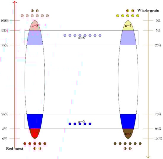 - Observations located in the upper red meat quantile, and lower whole-grain quantile (n = 8) (marked in light blue in Figure 1)