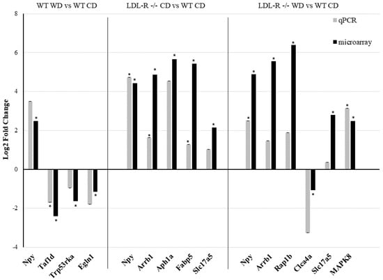 Gene expression by qRT-PCR of genes identified by microarray analysis in hippocampal microvessels. Eleven genes (Npy, Taf1d, Trp53rka, Egln1, Arrb1, Aph1a, Fabp5, Slc17a5, Rap1b, Clca4a, MAPK8) were tested by qRT-PCR in the hippocampal microvessels isolated from wild type (WT) and LDL-R−/− mice fed with the control diet (CD) and Western diet (WD) and showed the same trend in gene expression as the microarray. Expression levels were expressed as a log2-fold change (* p ≤ 0.05 for WT-WD, LDL-R−/− CD, and LDL-R−/− WD when compared with WT-CD).
