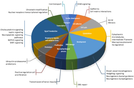 Next, we performed gene network analyses using a text-mining algorithm (MetaCore) to identify the functional groups of the gene networks (Figure 2). Using this approach, we identified gene networks involved in cell adhesion (cell–matrix interactions and cadherins), cytoskeleton (cytoplasmic microtubules, intermediate filaments, macropinocytosis and its regulation), proliferation, proteolysis, transcription (nuclear receptors transcriptional regulation, chromatin modification), development, and signal transduction (Wingless and Int-1 (WNT) signaling, Notch signaling or neuropeptide signaling pathways). The gene network analysis suggests that lipid injury can principally affect the expression of genes involved in cellular network processes that participate in cell adhesion, development, or signal transduction.