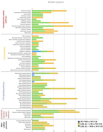 Following the gene network analyses, we used KEGG and MetaCore to identify the cellular pathways for the differentially expressed genes. We observed the differential regulation of a number of important cellular pathways including those for neurological function-related pathways (axon guidance, long-term depression, or neuroactive ligand–receptor interaction), cellular metabolism (fatty acid metabolism, ABC transporters, glutathione metabolism, or oxidative phosphorylation), cell signaling (Nf-kB signaling, p53 signaling, Raps1/Ras signaling, insulin signaling, cAMP signaling, or MAPK signaling pathways), endothelial function (focal adhesion, gap junction, or tight junction), and a few other cellular processes (Figure 3). In general, when compared with the WT-CD mice, the LDL-R−/− genotype showed a larger number of genes involved in the differential expression of cellular pathways. The gene network analyses showed a similar trend to the pathway analyses for the LDL-R−/− genotype.