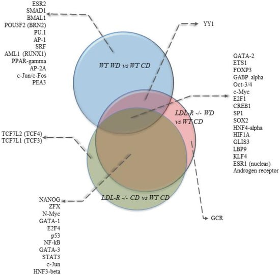 We also performed bioinformatics analyses of the gene expression data to identify potential transcription factors (TF) whose activity could be modulated by lipid injury and be involved in mediating the observed genomic effects. The most statistically significant transcription factors were ETS1 (ETS proto-oncogene 1), c-Myc (cellular myelocytomatosis), FOXP3 (forkhead box P3), and GABPalpha (GA binding protein transcription factor) (Supplemental Table S6). Comparisons of the top 30 transcription factors (TFs) identified in our study groups are shown in Venn diagrams in Figure 4. Among the top TFs, 17 were in common for the 3 diet and genotype groups. Eleven TFs were in common between the LDLR−/− mice on the CD and the LDLR−/− mice on the WD compared with the WT mice on the CD, while no common TFs were identified between LDLR−/− on the CD and WT on the WD. One TF (YY1) was in common between LDLR−/− on the WD and WT on the WD.