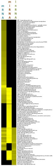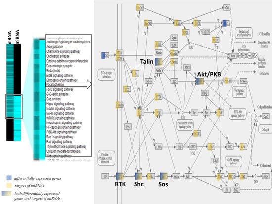 The comparisons of the pathways identified with the differentially expressed genes and pathways identified using the target genes of miRNAs revealed a group of pathways in common between the two modes of gene regulation (Figure 5). Among the pathways in common were the chemokine signaling pathway, focal adhesion, gap junction, insulin signaling, Nf-kB signaling or Gap junctions, and pathways that regulate endothelial cell interaction and permeability. The integrated analyses of focal adhesion or the Rap1 signaling pathway showed that most of the genes were either differentially expressed following lipotoxic injury or were potential target genes of differentially expressed miRNAs. This observation suggests a potential dual mode of action of lipotoxic injury in brain endothelial cells—both at the transcriptional and post-transcriptional levels of regulation.