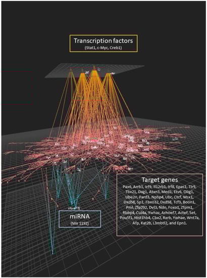 Protein–protein network enriched with transcription factors and miRNA regulation. Protein–protein interactions were identified using the STRING database from differentially expressed genes. Interactions between the protein–protein network, differentially expressed miRNAs (Mir 1192), and potential transcription factors (Stat1, c-Myc, Creb1) were constructed using the OmicsNet online tool. Target genes are: Pax6, Arrb1, Irf9, Il12rb1, Irf8, Epas1, Tlr9, Tbx21, Dag1, Atxn3, Med1, Etv6, Olig1, Ube2n, Pard3, Nphp4, Ubc, Ctcf, Msx1, Dxd58, Sp1, Fbxo32, Dxd58, Tcf3, Boon1, Pml, Zfp292, Dvl3, Ndn, Foxo1, Zfpm1, Rbbp4, Cul4a, Ywhaz, Arhoef7, Actef, Set, Pou5f1, Hist1hb4, Cbx2, Rxrb, Ywhae, Wnt7a, Afp, Kat2b, L3mbtl2, and Epn1.